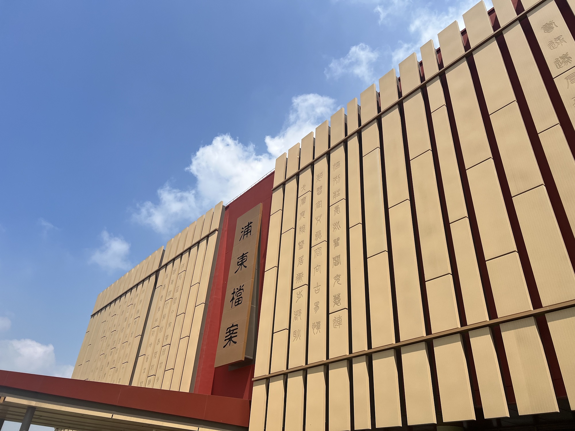 當(dāng)走近位于百潤(rùn)路100號(hào)的上海浦東新區(qū)檔案館時(shí),瞬間被這座充滿中國(guó)文化底蘊(yùn),用一方方紅色印章與一片片原色竹簡(jiǎn),巧妙搭配的建筑深深吸引。